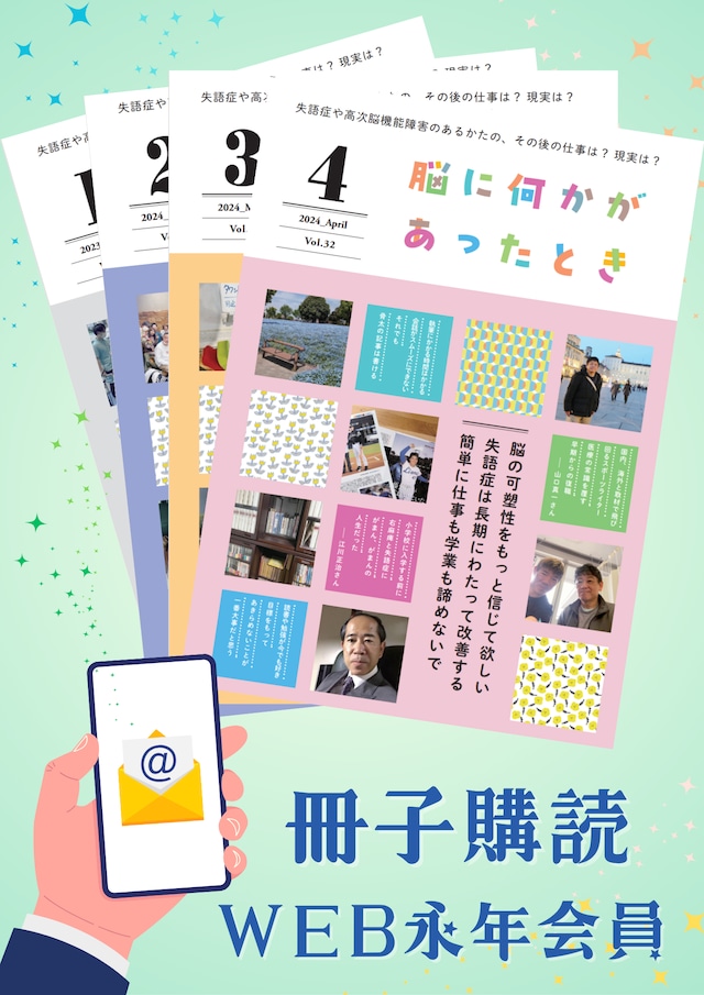 NPO法人Reジョブ大阪の月刊誌「脳に何かがあったとき」WEB版です。 ※紙の冊子ご購読は、冊子月会員にてお申込みください。 この冊子は、 高次脳機能障害や失語症のある方の、その後の仕事と現実を 毎号2名ずつインタビューしています。 復学、復職、再就職してから何に困ったか、 その困りごとにどう工夫したか。 そのリアルな声は、当事者の方、ご家族の方、職場の方はもちろん、言語聴覚士をはじめ、支援職、介護職の方 みなさんにきっと役に立つ「知恵」が詰まっています。 冊子会員3つの会員特典! ①毎月冊子が届きます ②毎月のオンライン交流会に無料ご招待します ③会員限定サイトにご招待します ★紙冊子会員:月会員1,000円 年会員10,000円(年会員は2,000円お得です!) ★WEB会員:月会員500円 年会員6,000円(冊子WEB版をメールにてお送りします) ★永年WEB会員:10,000円(会員期限はありません)永続的にWEB版をご覧いただけます! お得な、紙・WEBの年会員申込みはこちらの Reジョブマガジンサイトからお願いします→https://rejob-magazine.com/